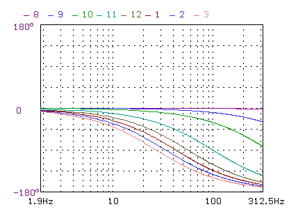 這是7點鐘、9點鐘、12點鐘和3點鐘之間位置的比較。請注意,5點鐘還沒有被畫出來,因為它與是3點鐘位置的一樣。增益設定12分貝(dB)且頻率設定為20赫茲(Hz)。
