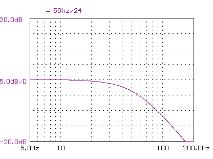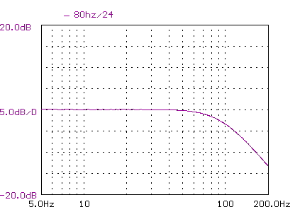 對於不使用低音管理的用戶:可選擇50hz/24或80hz/24。50hz/24是指板形放大器擁有一個低通濾波器,在50赫茲(Hz)有一個固定的12分貝衰減,外加一個12分貝衰減的可調旋鈕,用以建構總量為24分貝(dB)衰減的總斜率。80hz/24也是同樣的作法。下面顯示50Hz和80Hz固定濾波器的頻率響應。