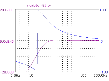 隆隆聲濾波器的響應和相位。隆隆聲過濾器有一個固定在20赫茲(Hz)的三階斜率(18dB/octave)。