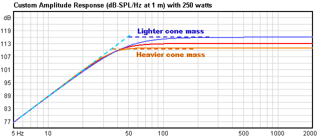 減輕喇叭線圈本身的質量將使質量控制區的曲線上移(本質上就是提高了這一區的工作效率);而增加喇叭線圈的質量則會有反效果。與原來曲線相比,上圖其他顏色曲線顯示輕線圈與重線圈之間的不同。我們可以看到截止頻率會向上提升(輕線圈)或下降(重線圈)。當輕線圈將下降的截止頻率向上提升時,它實際上會產生更多音樂與動態的聲音(不是因為輕線圈「移動較快」,而是因為輕線圈的質量控制區具有較低的失真)。相反地,重線圈確實會延伸下降的截止頻率,然而,必須付出的代價是在質量控制區內令人沮喪的效率。有趣的是,為了依賴重線圈以達到20赫茲的低音延展,在75公升容積箱體中的典型12吋喇叭單體就需要質量大約600克的線圈,但在質量控制區的效率卻低於75db/1m/1W。既使只需要28赫茲的延展,仍然需要一個300克的沉重線圈(81db/1m/1W)。結論是,想利用T/S參數來實現低音延展是不切實際的。對於一個具有300克的典型線圈與150公升喇叭空氣容積(Vas)參數的12吋喇叭單體,為了實現20赫茲低音延展需要使用150公升容積的箱體。